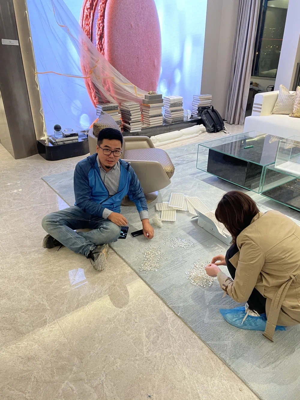 ▲开放前夜样板房软装摆场人手不够,设计师亲自上阵手工穿水晶灯珠,将无数个小挂件一一串起挂上。