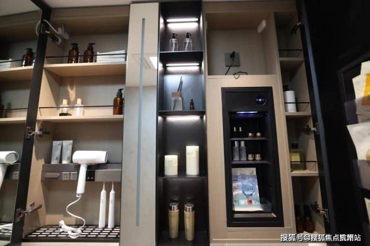 整面墙的镜柜,内部配备了美妆冰箱+门板收纳架+轨道式置物架,储物空间打造的非常充足。