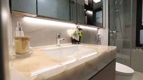● 卫生间:主卧的独立卫生间,洗手台面为天然玉石,独特的纹理和色泽,增添了一种自然、高雅的美感。