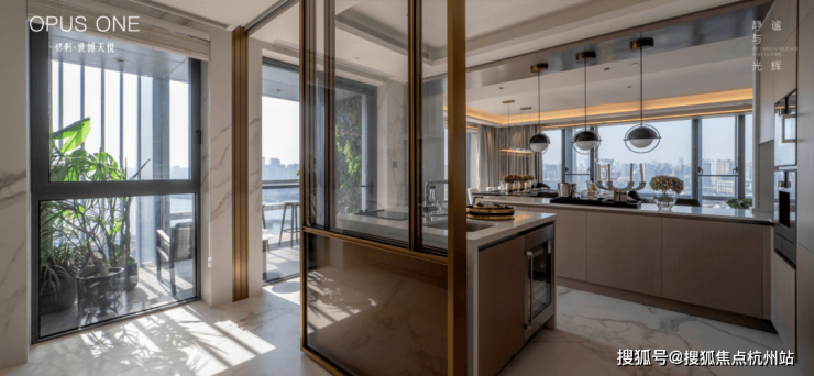 这客厅既是 270°全景舱厅 ,无论全家在餐桌前欢聚一堂,还是孩子们在客厅嬉戏,一抬头便是以江景和城市为主题的巨幅油画。又是 CEO派对方厅 ,是招待亲朋好友时最佳背景。