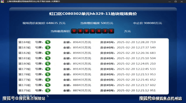 2025年2月,今年第一批次土拍中,经过184轮竞价,金茂&庆隆联合体以总价896435万元竞得虹口C080302单元hk329-11地块,溢价率38.2%,折合楼板价117474元/㎡,装修标准不小于4000元/㎡。
