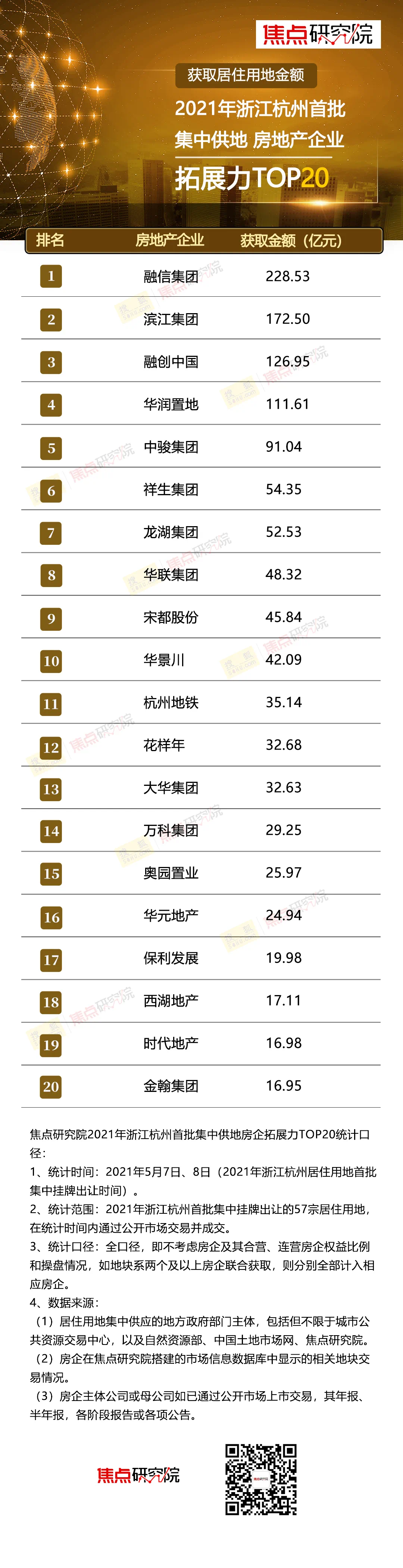 杭州首批集中供地成交超1100亿,融信滨江融创跻身拿地三强