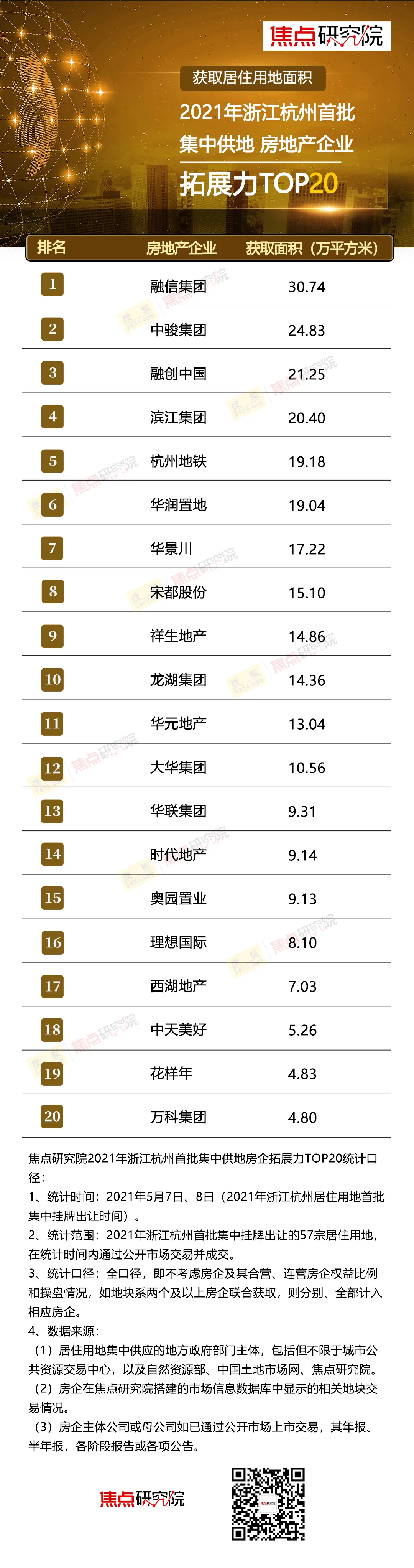 值得一提的是,融信在此次集中供地中获取7宗地块,面积30.74万平方米,约合461亩,成交价228.53亿元,获取地块规模位居开发商首位。杭州一直是融信的“福地”,2016年融信便以110.1亿元获取“中兴路壹号”项目,扣除公建、配套后实际成交楼面价高达14.3万元/平方米,创造了全国居住用地楼面价较高的记录。融信一直以来就以敢于获取高价地块而广受争议,且在2020年遭遇经营危机,在4月中旬连遭标普、惠誉两大国际评级机构下调评级,但不得不说,融信此前适逢杭州市场上行行情,融信杭州公司业绩一直位于集团前列,融信杭州负责人余丽娟也因此在2019年晋升为融信中国总裁。融信此次集中供地表现活跃,或是想借此在杭州市场打一场漂亮的翻身仗。