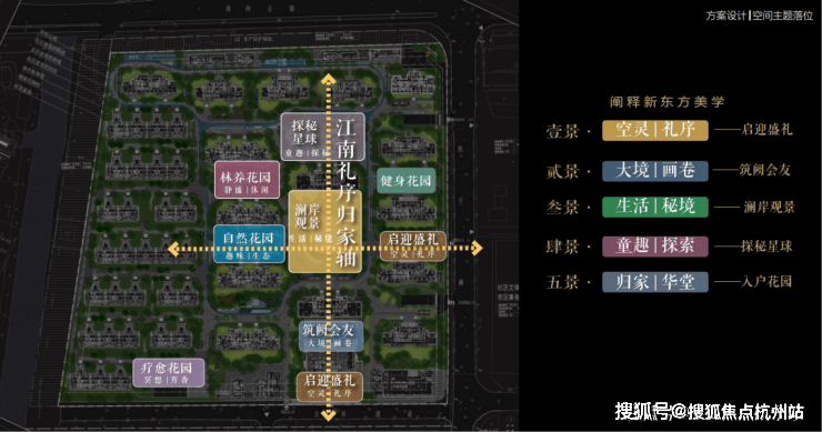 以江南人文精神为源点, 打造两轴一环五进空间,江南礼序归家轴串联启迎盛礼、筑阙会友、归家华堂等5重礼制,尊崇归家; 健康运动轴以24小时跑道为社区活力生活环,串联儿童乐园、长者康养、疗愈花园等10大生活场景,营造全龄全时的江南诗意生活