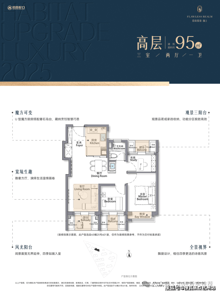 再加上南向大面宽短进深、全卧飘窗、L型转角阳台设计,哪怕小户型95㎡3房,尺度感都超棒,采光和视野更是一流。