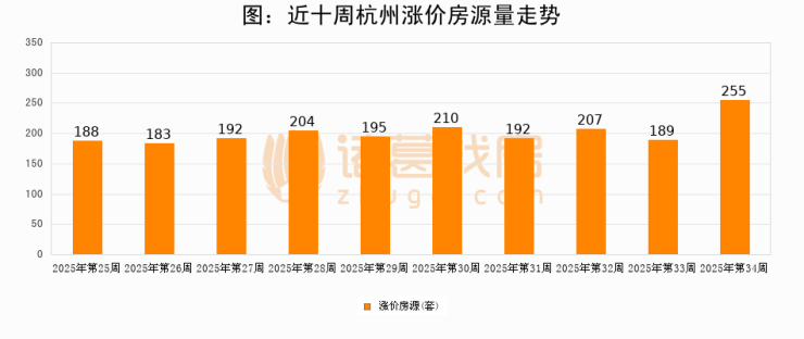 从调价房源来看,第34周杭州涨价房源255套,较上周上涨34.9%。与此同时,34周涨价房源占比提升1.47个百分点,业主信心持续恢复。