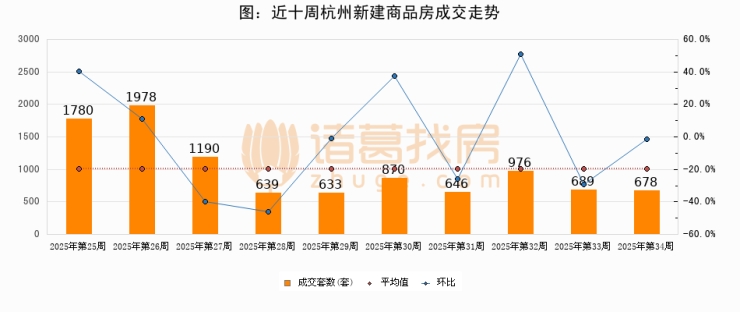 进入2025年第34周(08月18日-08月24日),杭州新建商品房成交678套,较上周减少11套,环比下降1.6%