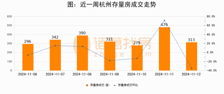从存量房来看,2024年11月12日杭州存量房单日成交313套,比昨日减少166套,环比下降34.7%。从近一周存量房成交来看,杭州存量房日均成交套数为345套,11月12日单日成交313套,低于近一周平均水平9.3%。