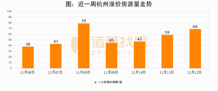 根据诸葛找房数据显示,杭州24小时涨价房源量为69套,较11月11日增加10套,环比上涨16.9%。与此同时,涨价房源占比小幅扩大,业主信心有所提升。
