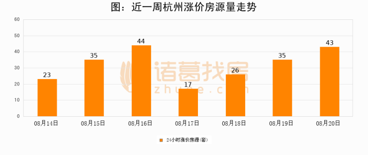 根据诸葛找房数据显示,杭州24小时涨价房源量为43套,较08月19日增加8套,环比上涨22.9%。与此同时,涨价房源占比小幅扩大,业主信心有所提升。