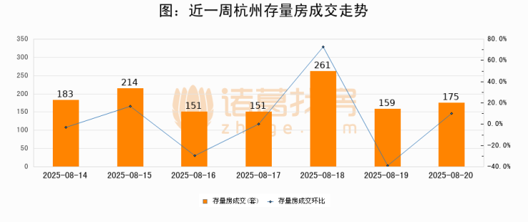 从存量房来看,2025年08月20日杭州存量房单日成交175套,比昨日增加16套,环比上涨10.1%。从近一周存量房成交来看,杭州存量房日均成交套数为184套,08月20日单日成交175套,低于近一周平均水平4.9%。