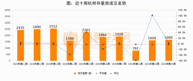 存量房方面,第20周杭州存量房成交1668套,较上周增加59套,环比上涨3.7%。从近十周成交走势来看,周均成交套数为1919套,本周低于平均水平13.1%。