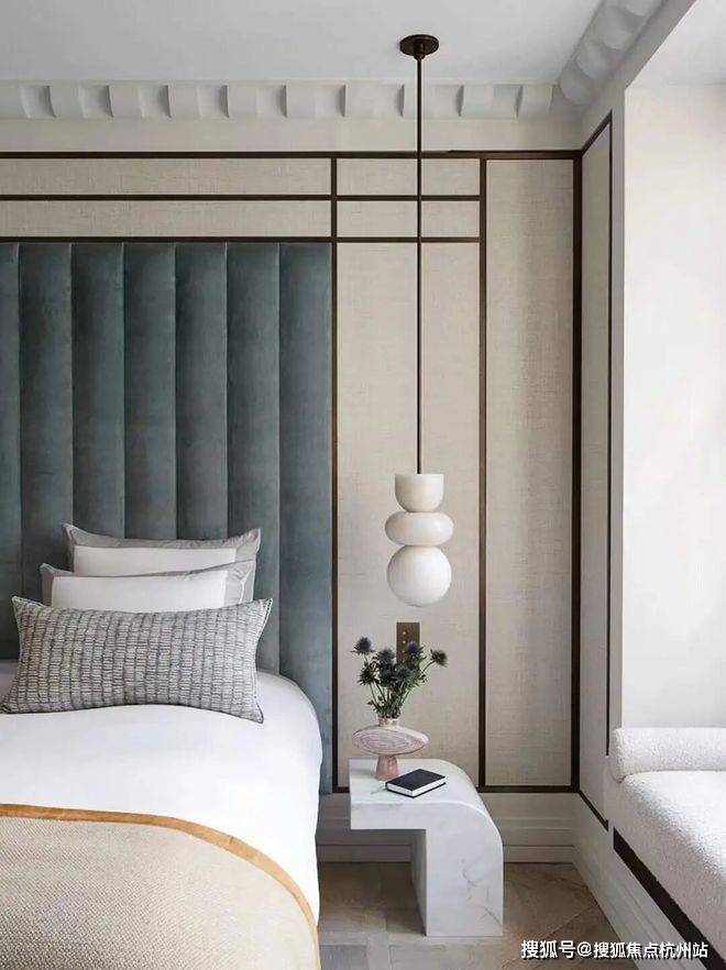 All three bedrooms face south, creating three suites. Pushing open the double doors and entering the master bedroom, the background wall is made of blue, green and beige wall fabric and leather soft packaging. The folding door is pulled to one side, forming an enclosed balcony. Sitting on the soft couch and looking out of the window at the City God Pavilion, the mountains offer the white clouds their hometown, allowing them to rest after their fatigue.