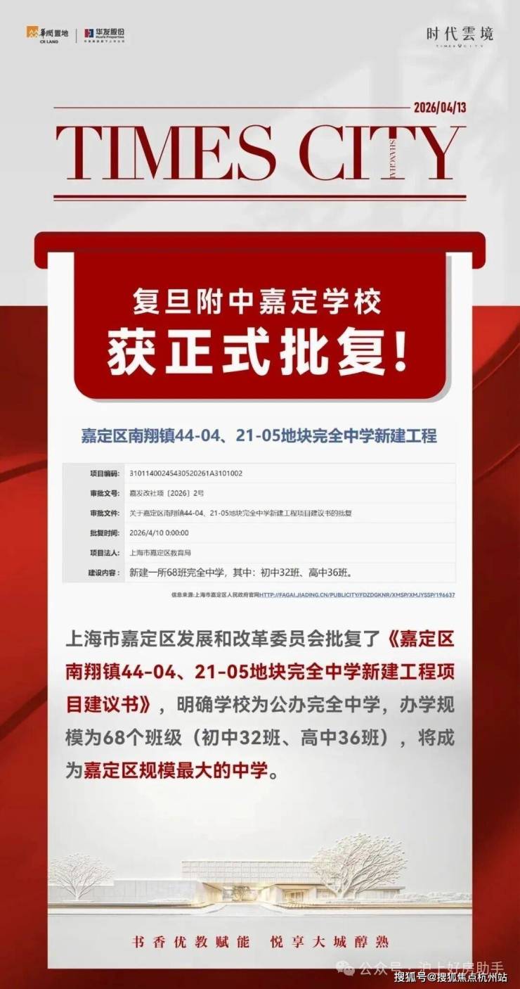 与项目一路之隔的复旦附中嘉定学校,预计2026年年内开建。近日,上海市嘉定区发展和改革委员会批复了《嘉定区南翔镇44-04、21-05地块完全中学新建工程项目建议书》,明确复旦附中嘉定学校为公办完全中学,办学规模为68个班级(初中32班、高中36班),将成为嘉定区规模最大的中学,赋能区域全龄教育矩阵。(信息来源:上海发展指南)
