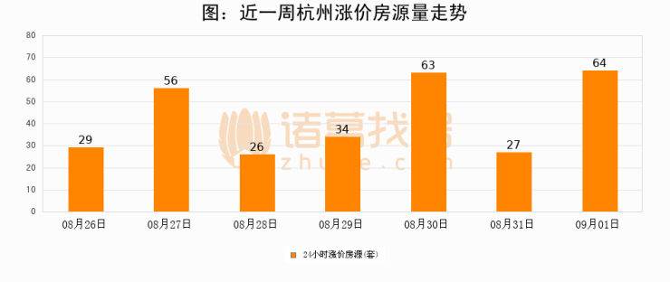 根据诸葛找房数据显示,杭州24小时涨价房源量为64套,较08月31日增加37套,环比上涨137%。与此同时,涨价房源占比小幅扩大,业主信心有所提升。