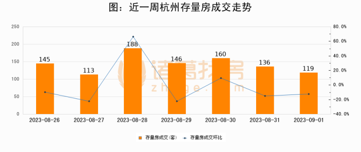 从存量房来看,2023年09月01日杭州存量房单日成交119套,比昨日减少17套,环比下降12.5%。从近一周存量房成交来看,杭州存量房日均成交套数为143套,09月01日单日成交119套,低于近一周平均水平16.8%。