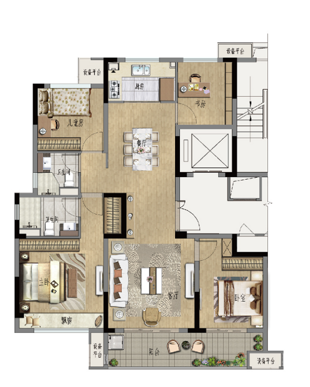旭辉府进阶四室产品,由客厅和餐厅组成的“家庭场景中心”统领中央,四个房间分别位于四个方位。全家人既可聚在“活力磁场”用餐追剧,回到“私人领域”后又能将彼此的干扰降到较低。即使是三代同堂,也能各有各的空间,让生活动静不扰。