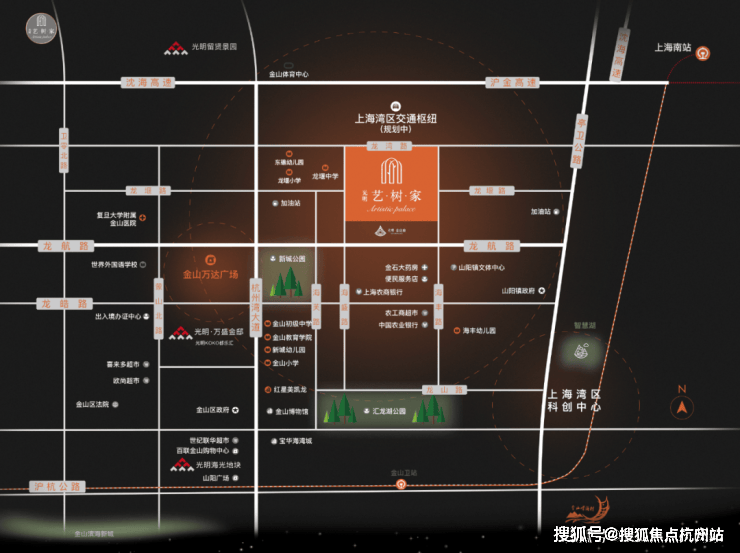 * 项目位于金山新城核心区,依赖区域现有配套。直线距离约1.3公里有金山万达广场,约1.4公里有复旦大学附属金山医院(三级乙等),能满足基本商业购物和医疗需求。