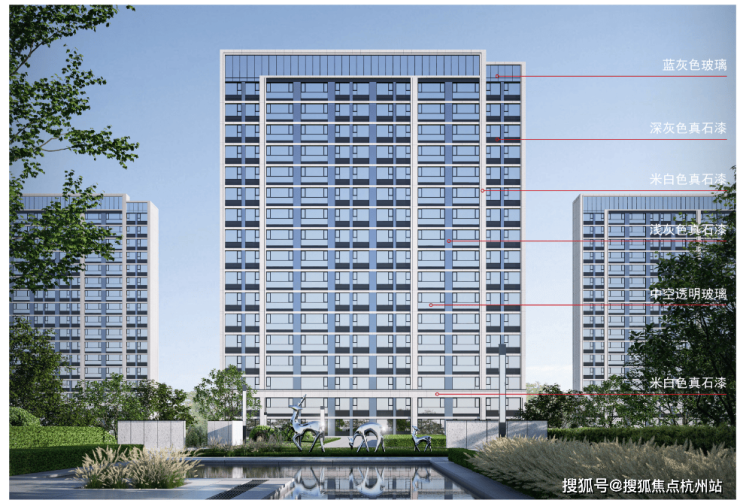 根据项目效果图来看,项目的外立面为蓝灰色玻璃、深灰色真石漆、米白色真石漆、浅灰色真石漆、中空透明玻璃、米白色真石漆。
