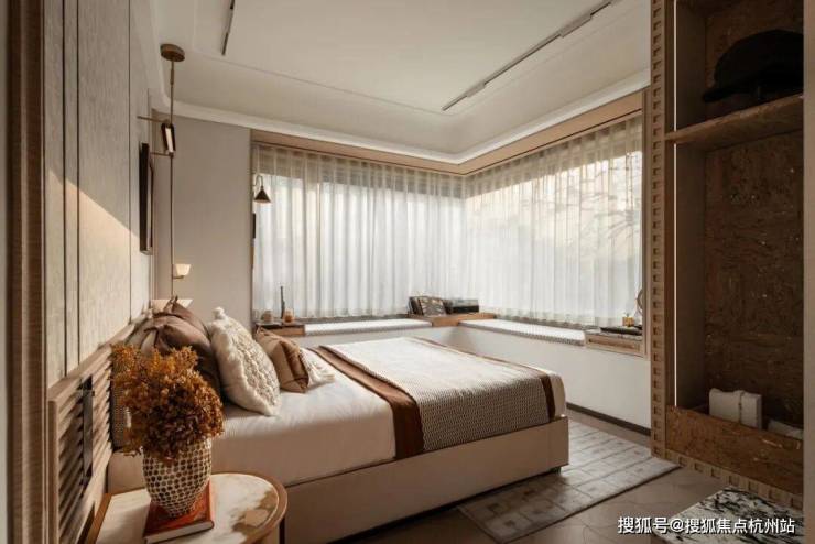●270°无柱飘窗的主卧套设计,打造出一座“空中观景舱”,将晨昏光影、四季流转尽数收纳,极大拓展了生活的视觉与心理边界,推窗即览美景,让居家时光更具诗意。