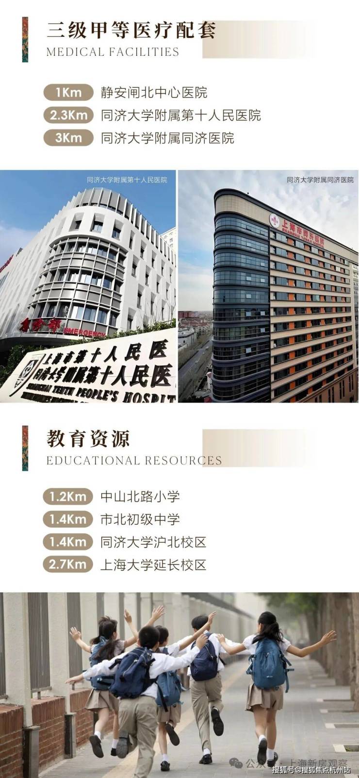 医疗:1 公里左右有静安闸北中心医院,2.3 公里处有同济大学附属第十人民医院,3 公里左右有同济大学附属同济医院。
