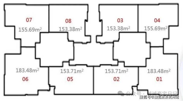 该栋分为A/B单元,每个单元有四个单位:包含3套153㎡及1套183㎡,平面布局与住宅相似。