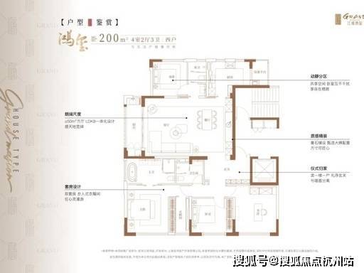 江湾鸿玺全盘仅有一种主力户型,为建面约 200㎡四房两厅三卫大平层,两梯两户配置,类一梯一户体验,私密尊崇感拉满,专为高端改善家庭量身定制。