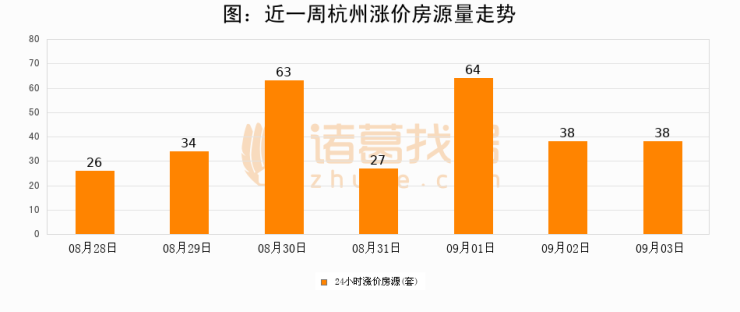 根据诸葛找房数据显示,杭州24小时涨价房源量为38套,较09月02日持平。