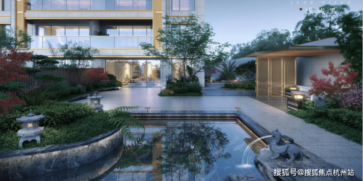即将首发的叠墅立面,以真石材与木纹铝板为主基调,纵横穿插香槟金金属线条,形成独具特色的鎏金立面,则让整个建筑瞬间变得通透轻盈。外立面用上石材的低密,在整个杭州都屈指可数。景观园林则是取源唐代大师李昭道《曲江图》,营造七境归家礼序,将自然山水在家楼下如画展呈。