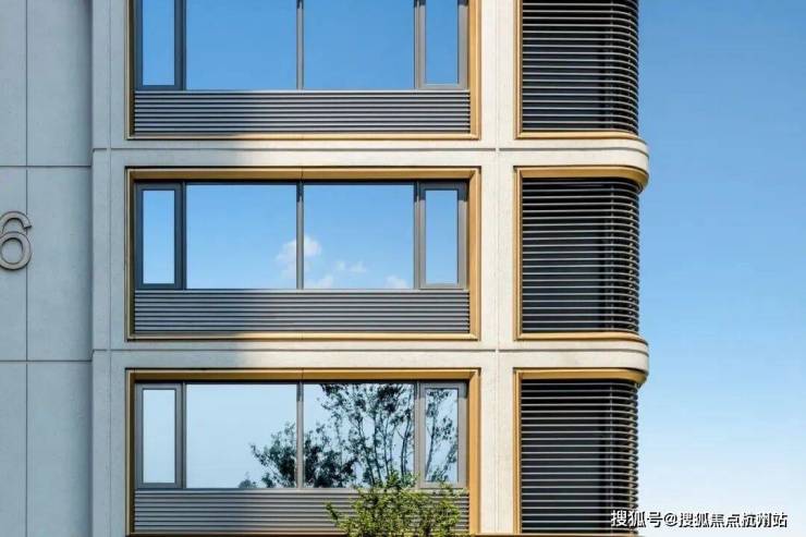 滨纷城便把建筑侧边做了圆弧角设计,南向外立面采用白色铝板、局部金属格栅等组合,金属线条用了经典9号库金色,远远望去,白金色搭配大气醒目。