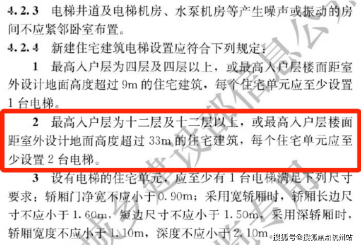 ② 5.1起执行住宅新国标,最高入户层为十二层及十二层以上,或最高入户层楼面距室外设计地面高度超过33m的住宅建筑,每个住宅单元应 至少设置2台电梯。