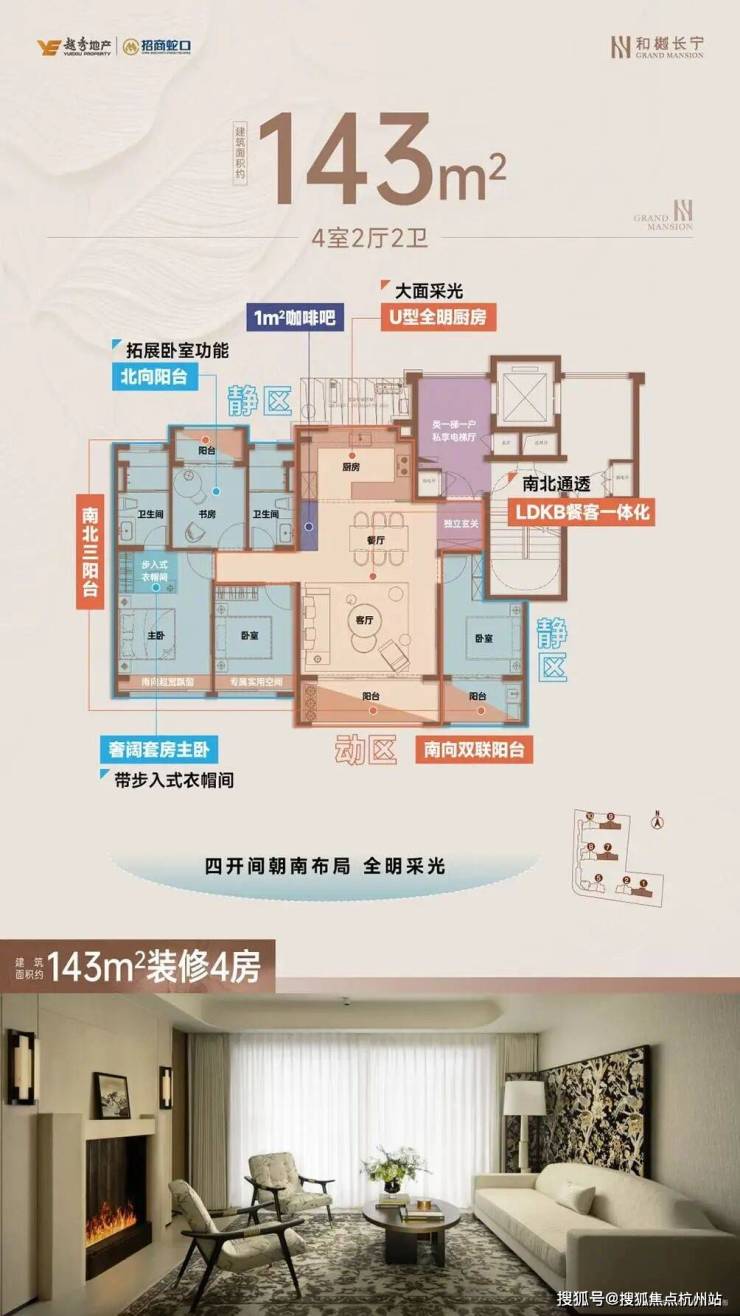 建面 约143平四房 阳台附赠更大、门口的私家电梯厅预测能有9-9.5个平方的附赠;如果都加在一起,实得率超92%, 实际可利用面积超过132平!
