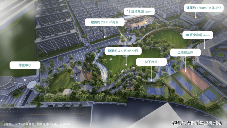 低密公园大城:总建面约 48 万方,规划有小高层、洋房、合院等,融入约 4.5 万方 “风之谷” 公园,是杭州第一个 “中央公园超级上盖”。