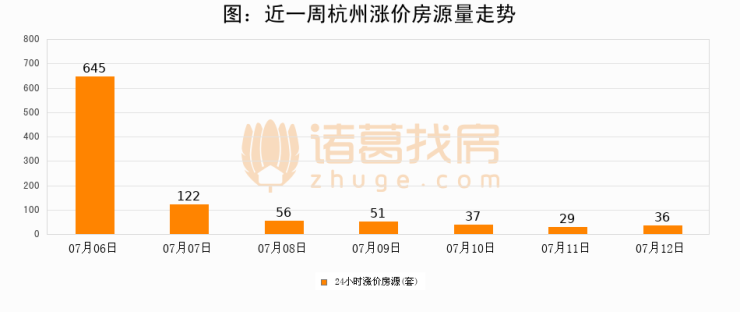 根据诸葛找房数据显示,杭州24小时涨价房源量为36套,较07月11日增加7套,环比上涨24.1%。与此同时,涨价房源占比小幅扩大,业主信心有所提升。