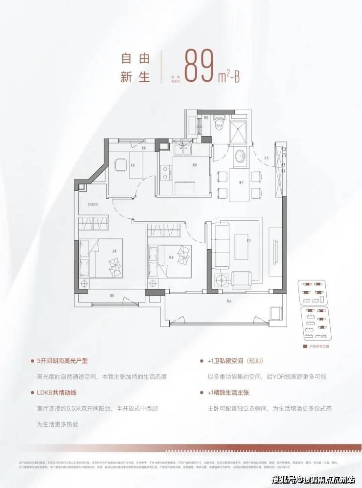 不同于一般的三房把这个小房间直接做了主卫,这个项目把选择权留给了购房者,并在下方铺设了上下水管、相当人性化!除了以上亮点之外,这个户型还有惊喜小细节。为了解决爱买买买的年轻人收纳痛点,户型设计上保留了厨房最大的收纳空间,可以打双组吊柜。在主卧和次卧都预留了收纳柜的位置。除了三开间朝南的经典户型,89m²还做了三面通风的户型。