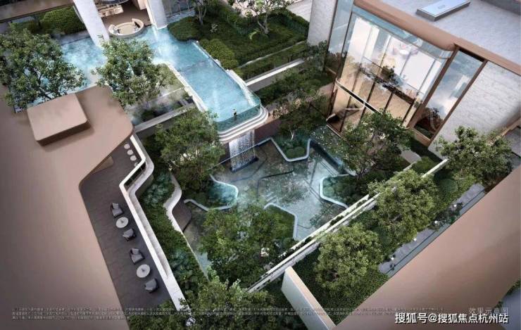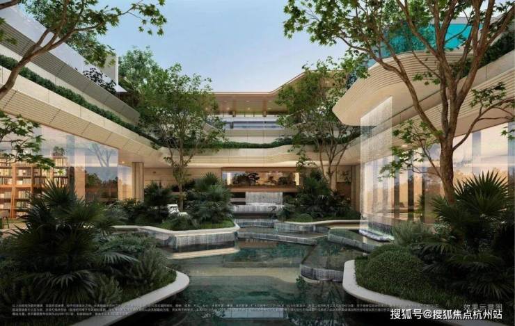 “漂浮的绿洲”,九重层次下沉庭院,区域悬浮泳池+4.3米飞瀑设计,塑造极致度假感受,丰富的视觉奇观。