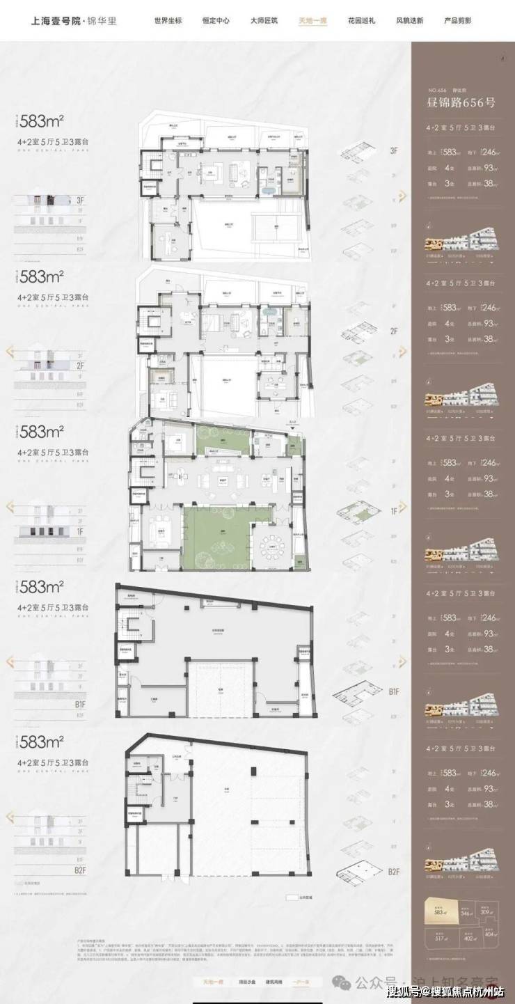 1.分支巷道拓宽至3-4米,诸多项目还停留在1-2米2.阳台和露台用格栅确保私密性和开阔性,防止对视3.立体住宅,分层内嵌,采光差的首次开创房子内部做天井,确保全户型全明、每个角落有光4.上海风貌层高最高的产品,很多户型层高:地下6.1米,一层3.9米,二层3.6米,三层3.6米5.外小内大,保护大户型隐私和品质6.很多户型双露台,大户型2-4个花园7.壹号院一贯作风,外部点状承重,设计多样性1)层高惊艳,上海风貌目前基本都是3.6/3.3/3.3(当然壹号院也有部分是这种层高的)