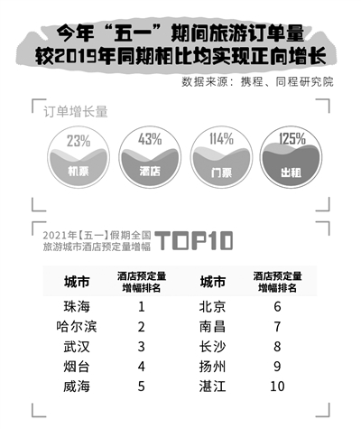 另外,热门旅游目的地“五一”期间激增的需求使得当地酒店客房预订“量价齐升”——部分地区的酒店平均价格甚至超过了疫情前水平。来自同程旅行平台住宿大数据显示,截至4月中旬,“五一”假期酒店客房预订量增幅(较2020年同期)较大的城市依次为:珠海、哈尔滨、武汉、烟台、威海、北京、南昌、长沙、扬州、湛江,其中,湛江、扬州、长沙等地的“五一”假期酒店预订量甚至超过了2019年同期水平。