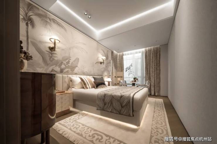 即便放了双人床、两个床头柜、一个收纳柜、两个休闲座椅和茶几,空间依旧绰绰有余,尺度感惊人!