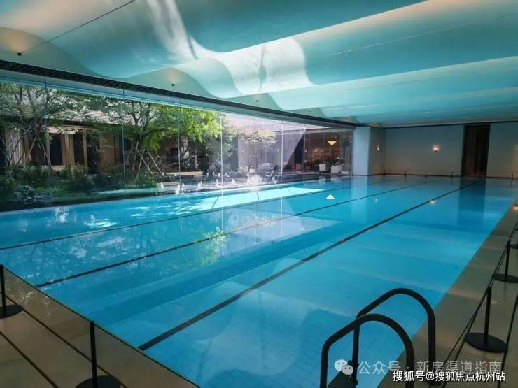 最后来看泳池。云邸玖章做了再升级。改为采用大尺度的落地玻璃拼接,约2.4米宽巨幅玻璃,且通过精致的玻璃交接细节处理增进室内外空间的融合,强调泳池的无界感,真正实现了无边泳池的效果、质的飞跃。