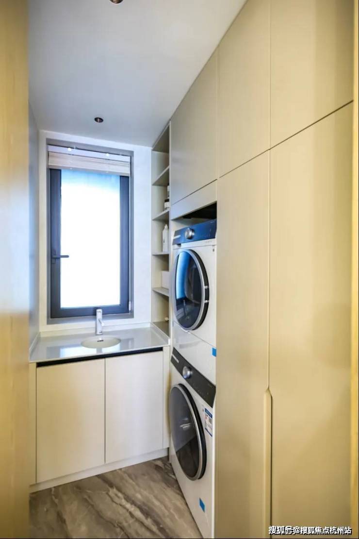 门内的玄关系统将艺术与功能结合,墙面采用汝瓷编织工艺背景,搭配天然石材置物台,地面以梵静黑与冰岛白双色石材拼花。侧边设有深色实木与米灰色编织纹皮革双开门的储藏间,将琐碎物品收纳于无形,使鞋帽、杂物与日常动线流畅衔接。家务间贴心预留洗衣、熨烫等专属空间,让生活更加高效从容,诠释了现代大宅的体贴与智慧。