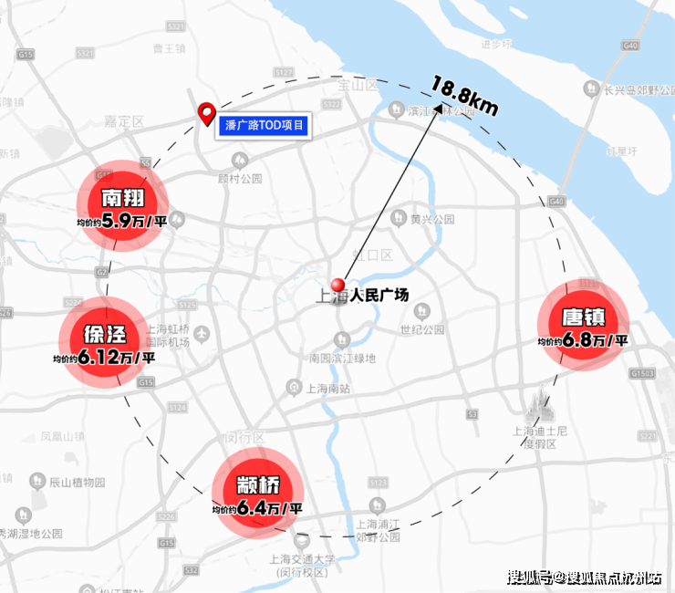 项目位于上海主城区,距离人民广场直线约18km,而以这个距离为半径画个圈,同纬度的是徐泾、南翔、颛桥以及唐镇。
