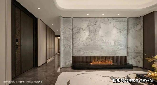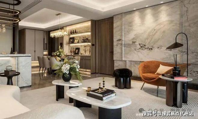 室内大量运用奢石,搭配统一木饰面与皮革材质,通过圆弧设计、隐形出风口、无高差客厨地面等“隐形美学”处理,让奢华与舒适完美融合。