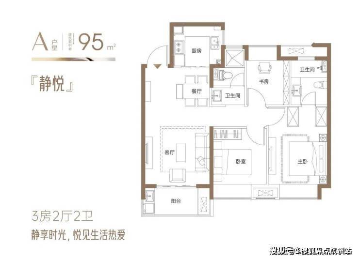 『静悦』约95㎡3房2厅2卫: 三开间向阳户型,面朝风景,沐浴阳光;全明通透,让阳光照进每一寸惬意生活;户户飘窗,逐光而居,延伸空间尺度;全明卫设计,赋予私密空间明亮与清新;。方正有序的空间艺术,舒适实用,张弛有度