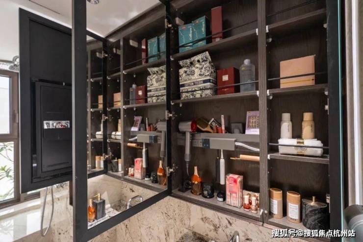 卫生间镜柜,同样是交付标准,内外双镜打造,主卫配置美妆冰箱,可用来收纳业主的面膜、化妆品等,设计贴心。
