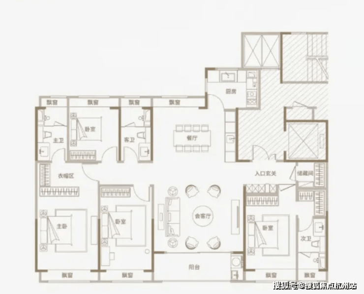 要知道,现在市面上的主流做法,是把三房的各个功能空间,都做飘窗设计,以得到更开阔的景观视野,并增加实际面积使用率。
