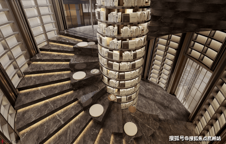 开发商在会所内,打造了苏州两层旋转式书架的中信书吧,这个艳压全城的“霍格沃茨式图书馆”。