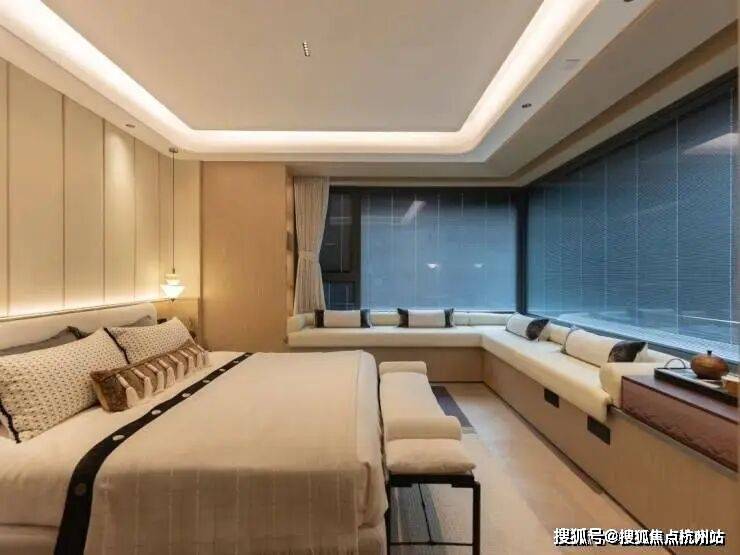 边户主卧套房配置 约270°观景飘窗 ,独立卫生间配备 浴缸与通长镜柜 ,尺度与私密兼具。