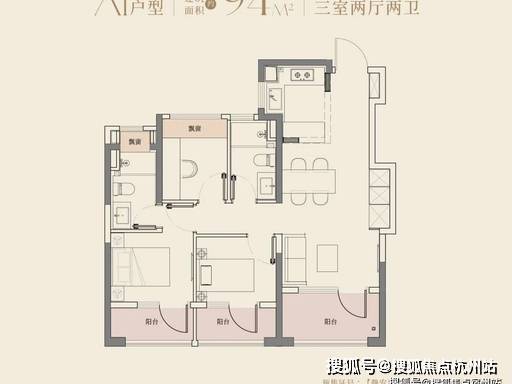 94㎡三房两厅两卫,是项目入门级刚改爆款,总价 460 万起,三开间朝南,南向面宽约 9.4 米,飞机户型设计,空间利用率极高,无浪费面积。客餐厅一体化连接南向阳台,采光通风极佳;主卧独立套房带独卫与飘窗,私密性强;两间次卧空间规整,可做儿童房或老人房,U 型厨房动线合理,干湿分离卫生间,适配三口之家或年轻刚改家庭。
