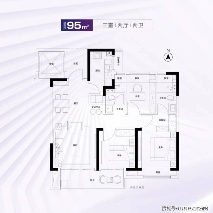 建面约95、96㎡室内拥有双开间大尺度阳台、全屋四处飘窗、套房式主卧,舒适度颇高。